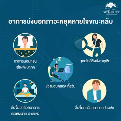 ภาวะหยุดหายใจขณะหลับ คืออะไรภาวะหยุดหายใจขณะหลับ เป็นภาวะผิดปกติที่พบมากในผู้ที่มีปัญหานอนกรน สาเหตุที่เป็นเช่นนี้เพราะอากาศสามารถไหลเข้าสู่ปอดได้น้อยลง จนถึงขั้นไม่มีอากาศไหลเข้าสู่ปอดเลยเป็นเวลายาวนานถึง 10 วินาที หรืออาจยาวนานกว่านั้นในบางเคส ปัญหาที่ตามมาคือ ออกซิเจนในเลือดต่ำลง ในขณะที่ก๊าซคาร์บอนไดออกไซด์ในเลือดกลับเพิ่มสูงขึ้น อาการเหล่านี้พบได้มากในผู้สูงอายุหรือกลุ่มคนที่มีน้ำหนักเกินเกณฑ์มาตรฐาน และอาจพบได้ในผู้ชายมากกว่าผู้หญิง อาจกล่าวได้ว่า โรคหยุดหายใจขณะหลับที่มาร่วมกับอาการนอนกรนเป็นโรคที่อันตราย และควรได้รับการรักษาอย่างเร่งด่วน ทั้งนี้อาจให้คนใกล้ชิดที่นอนด้วยช่วยกันสังเกตความผิดปกติที่เกิดขึ้น เพื่อจะได้รับการรักษาอย่างทันท่วงที