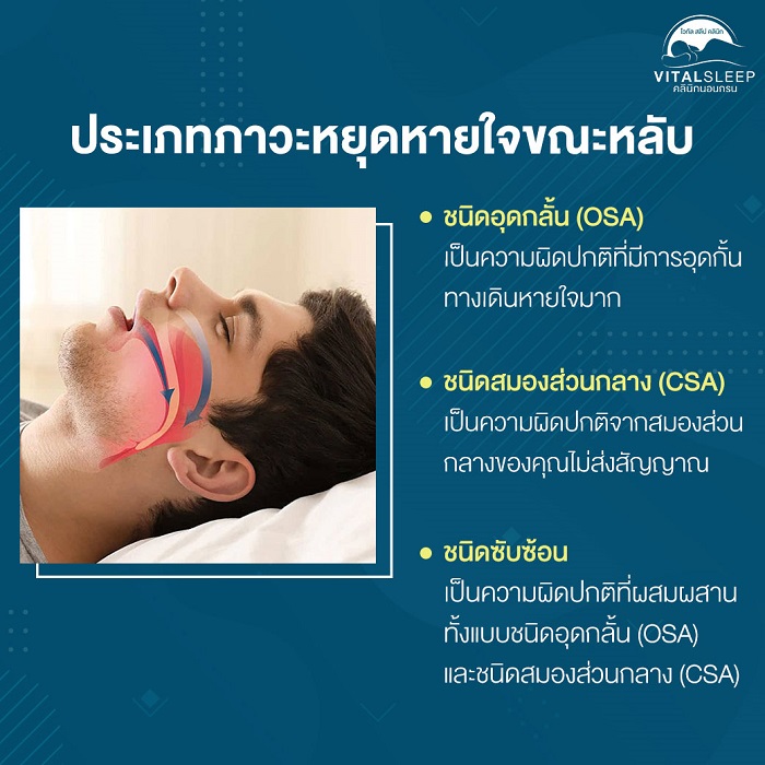 ประเภทภาวะหยุดหายใจขณะหลับ1. ภาวะหยุดหายใจขณะหลับ ชนิดอุดกั้น Obstructive sleep apnea (OSA) เป็นความผิดปกติที่มีการอุดกั้นทางเดินหายใจมากจนกระทั่งทำให้เกิดหยุดหายขณะหลับใจเป็นช่วงๆ ขณะนอนหลับ