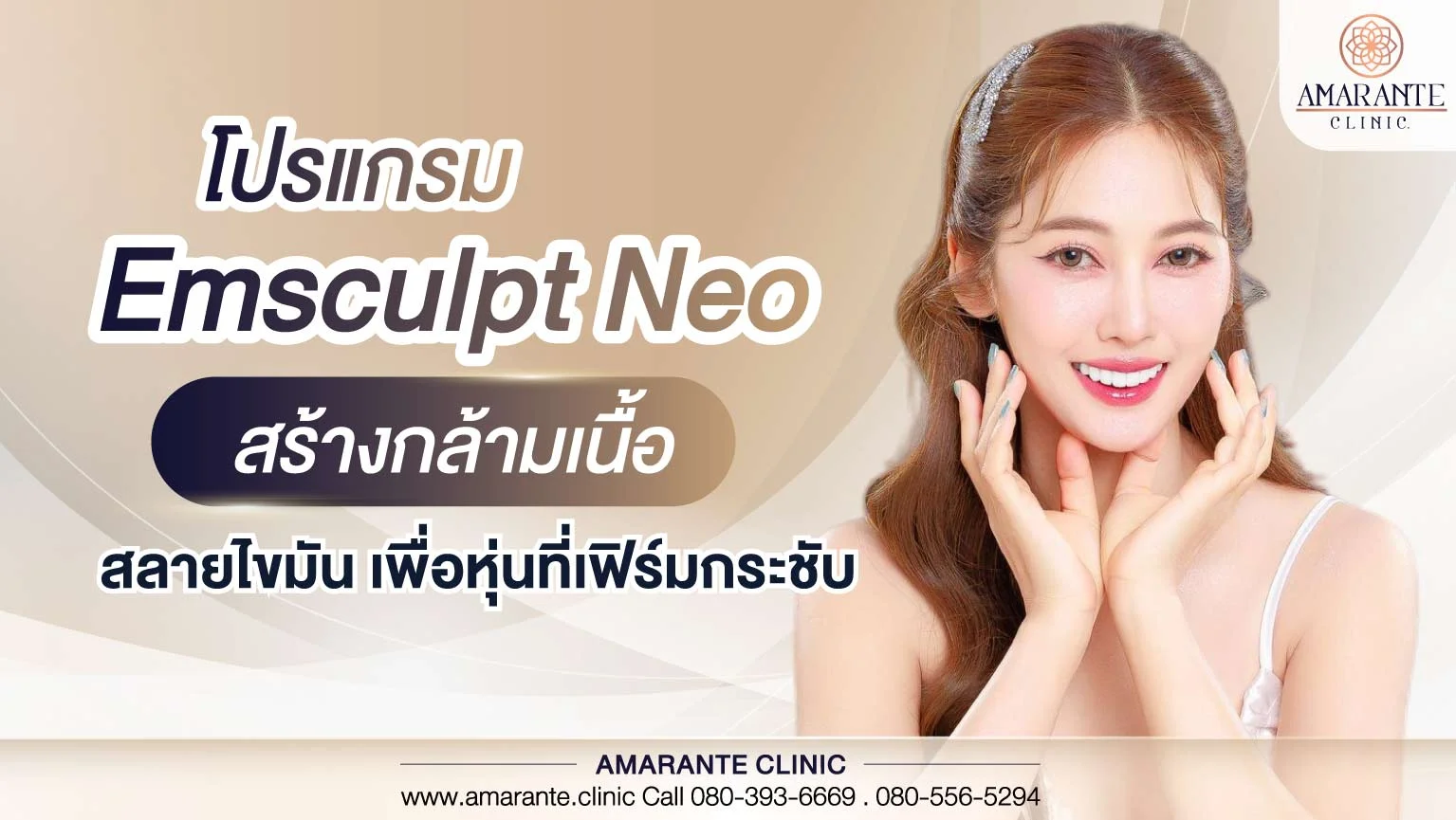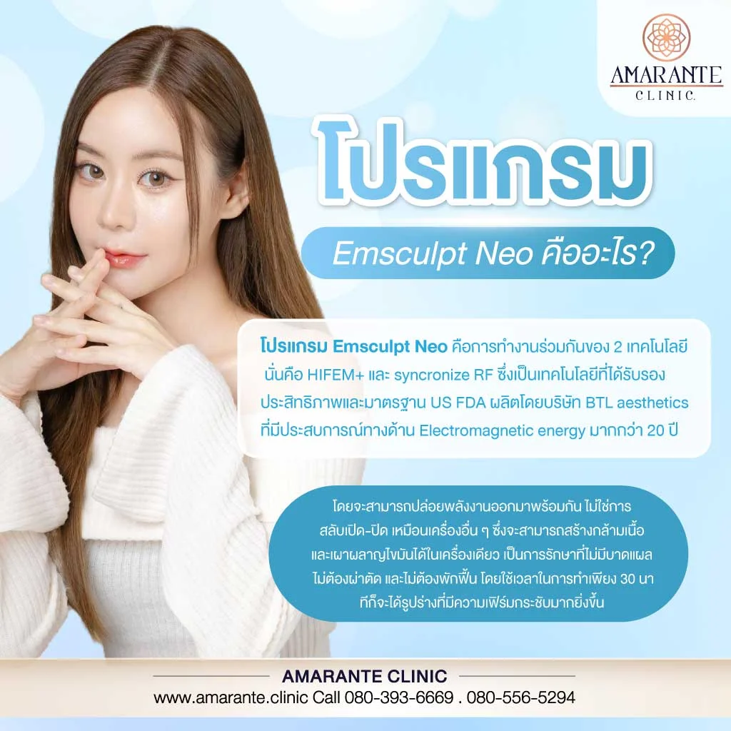 สุดท้ายนี้ Emsculpt Neo ถือเป็นอีกหนึ่งเครื่องที่น่าสนใจมาก ๆ สำหรับคนที่อยากหุ่นดี โดยไม่ต้องออกกำลังกายอย่างหนัก หรือมีปัญหาเรื่องสุขภาพที่ออกกำลังกายเอยะไม่ได้ แต่อย่างให้หุ่นกลับมาสวยในเวลาที่เร็วที่สุด หลังจากทำโปรแกรม Emsculpt Neo คุณสามารถเห็นการเปลี่ยนแปลงของร่างกายภายในไม่กี่สัปดาห์ โดยจะรู้สึกได้ถึงความกระชับของกล้ามเนื้อและการลดลงของไขมันในบริเวณที่ทำการรักษา โดยคุณสามารถเข้ามาใช้บริการ โปรแกรม Emsculpt Neo ได้ที่ Amarante clinic ได้เลย