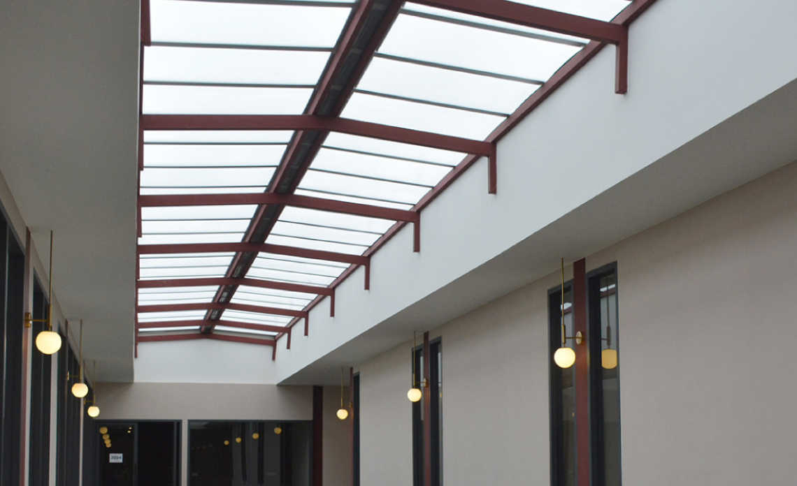 ในปัจจุบันอาคารโมเดิร์นส่วนใหญ่ มักจะมีทางเชื่อมอาคาร เพื่อสร้างบรรยากาศที่ดูใกล้ชิดธรรมชาติ ซึ่งแผ่นโพลีคาร์บอเนต จะเข้ามาช่วยเติมเต็ม Mood & Tone ของอาคารให้ดูโมเดิร์นขึ้น เพราะวัสดุมุงหลังคาชนิดนี้ สามารถออกแบบให้แสงตกกระทบพื้นหรือผนังอย่างมีมิติ ช่วยเสริมบรรยากาศให้พื้นที่ทางเดิน ดูมีชีวิตชีวาและปลอดโปร่งมากยิ่งขึ้น