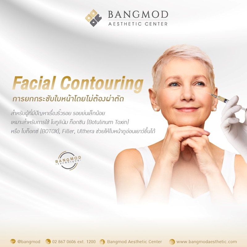 ต่อกันด้วย ศาสตร์ที่ 2 Facial Contouring สำหรับผู้มีปัญหาเรื่องริ้วรอย รอยย่น ผิวหย่อนคล้อยไม่มาก ในระดับ Grade 2 เหมาะกับการใช้โบทูลินัม ท็อกซิน (Botulinum Toxin) หรือ โบท็อกซ์ (BOTOX®) ซึ่งเป็น Neurotoxin เมื่อฉีดเข้าบริเวณชั้น Dermis และฉีดเป็นจุดเล็ก ๆ จะช่วยกระตุ้นคอลลาเจนใหม่ให้เกิดขึ้น ทำให้กล้ามเนื้อใบหน้าทำงานลดลง ใบหน้าดูยกขึ้น ตึงกระชับ นอกจากนั้นการฉีด Botulinum Toxin ก็สามารถช่วยลดริ้วรอยบนใบหน้าที่นิยมฉีดกัน ได้แก่ รอยตีนกาบริเวณหางตาทั้งสองข้าง หรือริ้วรอยระหว่างคิ้ว ริ้วรอยกลางหน้าผากและบริเวณกราม