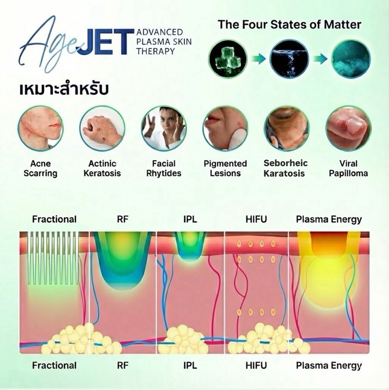 ในยุคที่ความงามก้าวไปข้างหน้าอย่างไม่หยุดยั้ง ทั้งคอลลาเจนสดแบบฉีด สารกระตุ้นคอลลาเจนแบบต่าง ๆ หรือบรรดากลุ่มเครื่องใช้ที่บำบัดด้านความงาม จะมีกลุ่มที่เป็นเลเซอร์ เช่น Pico, Erbium, CO2 และไม่ใช่เลเซอร์ เช่น HIFU (ชื่อการค้า Ulthera prime) คลื่นวิทยุ (ชื่อการค้า Thermage FLX, XERF) และยังมีอีก 1 กลุ่มที่ซ่อนตัวที่ไม่ใช่เลเซอร์ แต่ให้ผลคล้ายเลเซอร์แบบกรอผิว (Coring) นั่นคือ Nitrogen plasma (ชื่อการค้า Agejet) นวัตกรรมมาแรงสุด ๆ ในอเมริกา ที่ใช้พลังงานบริสุทธิ์จากสถานะที่ 4 ของสสาร หรือที่เรียกว่า พลาสมา (Plasma) ซึ่งแม้พัฒนามากว่า 10 ปี แต่เทคโนโลยีนี้เพิ่งเข้ามาในเอเชีย เพื่อแก้ปัญหาผิวไหม้ดำ คล้ำ หลังการทำเลเซอร์