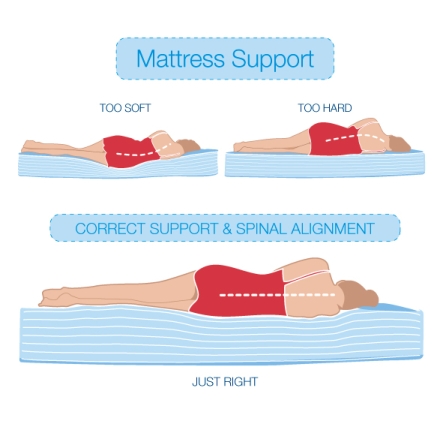 ที่นอนควรมีขนาดกลางๆ ไม่นิ่ม  หรือแน่นเกินไป (แต่ถ้าต้องเลือกระหว่างที่นอนนิ่ม กับที่นอนแน่น ควรเลือกที่นอนแน่น เพราะที่นอนนิ่มจะทำให้ปวดหลังได้มากกว่า)  แต่ทั้งนี้ก็ขึ้นอยู่กับโครงสร้างและสรีระของแต่ละบุคคล ถ้าคุณลองนอนดูแล้วไม่เกิดอาการปวดหลังก็ถือว่าใช้ได้  และควรเลือกที่นอนที่ยาวกว่าความสูงของตัวเองอย่างน้อย 15  ซม. และพิจารณาสิ่งสำคัญต่อไปนี้ด้วย