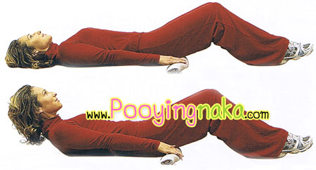 1. นอนหงายงอเขา เอาผ้าขนหนูม้วนรองสะโพกไว้ มือแตะผ้าขนหนู ค่อยๆไสเท้าห่างจากตัวไปจนปลายเท้าคุณลอยจากพื้น