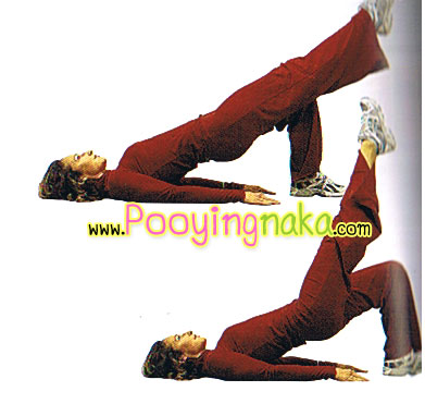2. ยกหลังขึ้นช้าๆให้ลอยจากพื้นเกร็งหน้าท้องไว้แล้วยกเข่าสูง