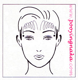 นวดเป็นวงโดยเริ่มจากกึ่งกลางหน้าผาก แล้วกดเบาๆบริเวณขมับทั้ง 2 ข้าง