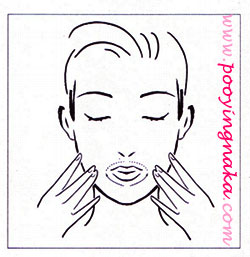 เริ่มนวดจากบริเวณกึ่งกลางริมฝีปากล่างไปยังขอบปาก ยกมุมปากขึ้น แล้วปล่อยนิ้วไปข้างหน้า