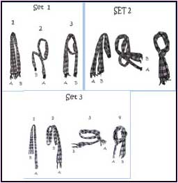 แบบที่ 3 เริ่มข้อแรกจับปลายผ้า โดยให้ด้าน A ยาวกว่าด้าน B เล็กน้อย 2.งอผ้าพันคอ แล้วพาดไว้ที่ไหล่ 3.นำปลายผ้าพันคอด้าน A สอดเข้าช่องว่างระหว่างผ้าพันคอ 4.ดึงปลายด้าน A กลับมาอีกด้านเพื่อให้ทั้งสองด้านเท่ากัน