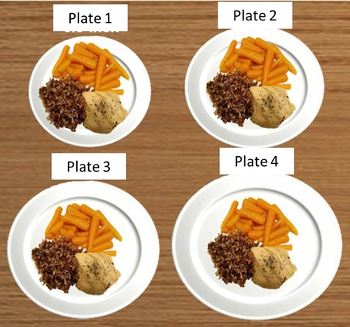 นอกจากนั้น ถ้วยชามที่ใช้ควรมีขนาดเล็ก ไม่ควรใช้จานเปลใหญ่ในการตักอาหาร เพราะเป็นหลักจิตวิทยาว่า ถ้าคนเห็นอาหารเต็มชาม แม้ชามจะขนาดเล็กกว่าปกติ จะทำให้คนเราอิ่มได้เร็วขึ้น ดังนั้น ควรลดขนาดภาชนะบนโต๊ะอาหารลงเสียตั้งแต่ตอนนี้ ดูจากภาพจะเห็นได้ชัดว่าอาหารปริมาณเท่ากันในทั้ง 4 จาน แต่เมื่ออยู่ในจานเล็กจะดูเยอะกว่าทุกๆจาน