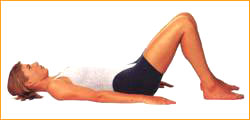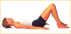 1. นอนราบลงบนพื้น งอเข่าขึ้น วางเท้าราบกับพื้นโดยให้เท้าห่างกันประมาณ 1 ฟุต หรือให้อยู่แนวเดียวกับสะโพก ส่วนแขนวางไว้ข้างลำตัว