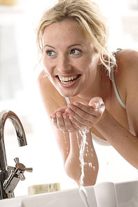 2.การล้างหน้า เวลาล้างหน้าอย่าใช้นิ้วชี้กับนิ้วโป้ง เพราะ 2 นิ้วนี้เมื่อกดลงใบหน้าจะมีแรงกดมาก ทำให้เกิดริ้วรอย ควรใช้เพียงนิ้วกลางและนิ้วนางเท่านั้น โดยเริ่มหมุนนิ้วออกเป็นวงกลม เริ่มจากบริเวณคาง คลึงนวดเบาๆ ไล่ขึ้นไปตามแก้ม ไล่จากบริเวณจุดกลางไปตามลายกล้ามเนื้อออกไปทางด้านข้าง ไล่ขึ้นไปที่หน้าผาก เป็นการต้านแรงโน้มถ่วง อาจจะเน้นบริเวณร่องข้างจมูก เพื่อหลีกเลี่ยงสิวเสี้ยน