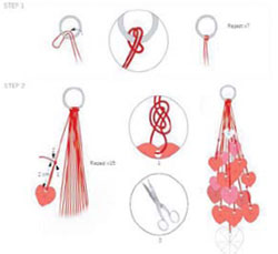 - ร้อยเชือกติดกับห่วงพลาสติกตามรูป ให้ความยาวของเชือกแต่ละเส้นไม่เท่ากัน ส่วนปลายของเชือกให้ร้อยเข้ากับจี้รูปหัวใจ ไล่ระดับต่ำ-สูงตามความสวยงาม