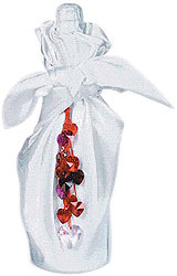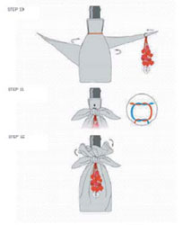 -       นำผ้าขาวที่มีขนาด 77X77 ซม. กางออก นำขวดวางไว้กึ่งกลางของผ้า จากนั้นพับและห่อตามรูป ขั้นตอนสุดท้ายนำห่วงพลาสติกที่ร้อยจี้คริสตัลรูปหัวใจที่ทำเสร็จแล้ว ร้อยเข้ากับปลายผ้า เท่านี้เราก็จะได้ขวดคู่รักแสนหวาน เอาไว้ฉลองวันแห่งความรักกันได้แล้วค่ะ