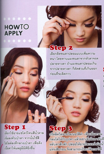 เลือกติดขนตาปลอม แบบเพิ่มความหนา โดยทาบแผงขนตาจากหัวตาจรดปลายหางตา ถ้าแผงขนตาปลอมเกินจากปลายหางตา ก็ตัดส่วนที่เกินออกก่อนที่จะติดกาว