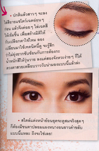 เลือกใช้อายแชโดว์ โทนสีน้ำตาลเข้มลงทั่วเบ้าตา จากนั้นใช้สีไฮไลต์ลงที่กลางเบ้าตา เพื่อดึงเนื้อตาให้แลดูมีมิติยิ่งขึ้น ปกติแล้วสาวๆ จะลงสีอายแชโดว์เฉดอ่อนๆ ก่อน แล้วจึงค่อยๆ ไล่เฉดสีให้เข้มขึ้น เพื่อสร้างมิติให้กับเปลือกตาใช่ไหม ลองเปลี่ยนมาใช้เทคนิคนี้ดู จะรู้สึกว่าไม่ยุ่งยากซับซ้อนกับการต้องกะน้ำหนักสีให้วุ่นวาย ลงแค่สองจังหวะง่ายๆ ก็ได้ดวงตาสวยเหลือบวาววับน่ามองแบบนี้แล้วล่ะ