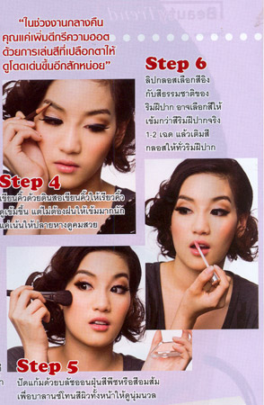 กรีดลิควิดอายไล เนอร์สีดำ เพื่อเพิ่มความกลมโตให้กับดวงตา แล้วอย่าเพิ่งลืมตาทันที หลับตาสักพัก ปล่อยให้อายไลเนอร์ชนิดน้ำแห้งเสียก่อน จึงสามารถเปิดเปลือกตาได้ ในช่วงงานกลางคืนคุณแค่เพิ่มดีกรีความฮอตด้วยการเล่นสีที่เปลือกตาให้ดูโดด เด่นขึ้นอีกสักหน่อย