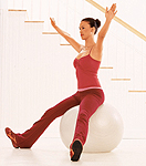 นั่งบน exercise ball กางขาเท่าสะโพก นั่งกระทุ้งลูกบอลพร้อมยกแขนขึ้นเหวี่ยงขึ้นข้างศีรษะ กระทุ้งอีกครั้งหนึ่งพร้อมเหวี่ยงแขนลงมา