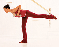 ถือน้ำหนัก ข้างละขนาด 3-8 ปอนด์ ยืนทรงตัวด้วยขาขวา โน้มลำตัวไปด้านหน้าจนขนานกับพื้น