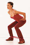 ผูกแถบยางยืดไว้รอบข้อเท้าทั้งสอง (ถ้าไม่มีก็ไม่ต้องใช้) ค่อยๆแยกเท้าออกจากกันเท่าขนาดช่วงไหล่ แล้วย่อเข่าลงจนขาด้านบนขนานกับพื้น (อย่าโน้มตัวมาด้านหน้า)