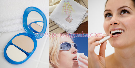 ควรเป็นแป้งที่ไม่ผสมรองพื้นและควรใช้สำหรับซับ โดยใช้พัฟฟ์ซับผงแป้งไว้ ก่อนจะห่อด้วยกระดาษทิชชู 1 ชั้น เพื่อป้องกันแป้งติดหน้าเป็นปื้น ไม่นวลเนียน เนื่องจากหน้าร้อน ผิวหน้ามีความชื้นมาก หากปัดแป้งลงมาโดยตรง หรือซับแป้งลงบนหน้าโดยไม่มีกระดาษทิชชูช่วยซับความชื้น แป้งก็จะเกาะกันเป็นปื้น ต้องเสียเวลาเกลี่ย และทำให้ไม่เนียนเรียบสม่ำเสมอ ก่อนเติมแป้งจึงควรจะซับหน้าให้แห้งดีเสียก่อน และที่ไม่แนะนำให้ใช้แป้งแข็งหรือแป้งผสมรองพื้น ก็เพราะจะทำให้เครื่องสำอางบนหน้าหนาขึ้นเรื่อยๆ จนเหมือน “โบกหน้า” มากกว่า “แต่งหน้า” ดูหลอกตาและไม่สวย