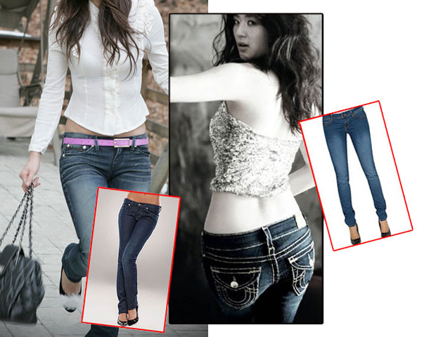 เริ่มกันที่สาวเอวบางร่างน้อย (สะโพกเล็ก) ต้องกางเกงยีนส์ทรงตรง ที่มีช่วงปลายขาบานสักเล็กน้อย  จะช่วยให้ดูมีสะโพก และมีส่วนเว้าส่วนโค้งสวยงาม ตรงกันข้ามกับสาวจ้ำม่ำ สะโพกดินระเบิด  ควรเลือกยีนส์สีเข้มๆ จะอำพรางรูปร่างให้ดูเพรียวขึ้น รูปแบบของยีนส์ ควรเลือกใส่กางเกงยีนส์เอวต้ำเข้าไว้ บวกกับกระเป๋าหลังจะช่วยดึงดูดความสนใจไปจากสะโพกได้