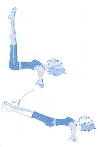 3.หายใจเข้าเตรียม หายใจออกเอนขาทั้งสองข้างลงทางซ้าย(หันหน้าถ่วงไปทางขวาเพื่อไม่ให้ตัวพลิก และลดอาการตึงลง) เอนต่ำ เลียดพื้น แต่ไม่ถึงพื้น เคลื่อนให้ช้า เกร็ง หยุดไว้ แป๊บนึง หมุนกลับมาตรงกลาง แล้วออกแรงจากหน้าท้อง งัด ขึ้นมา ช้าๆ เกร็งๆ