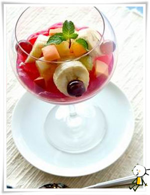 1. หั่นมะละกอ, สับปะรด, แคนตาลูป เป็นชิ้นสี่เหลี่ยม ส่วนองุ่นให้ล้างน้ำลอกเปลือกออก