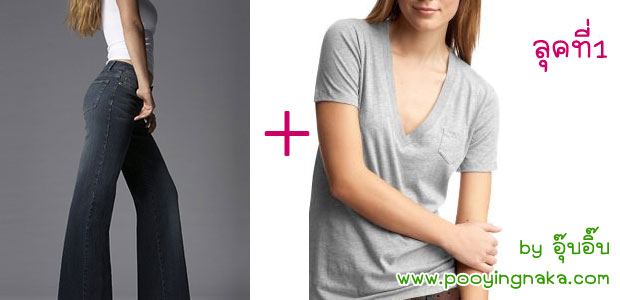 วันไหนที่เรารู้สึกตัวเองว่าอ้วนๆ หรือใครที่อ้วนอยู่แล้วควรมีกางเกงสไตล์นี้ไว้สักตัวนะ กางเกงยีนส์ที่ขาบาน แต่ด้านบนเข้ารูป ทำให้ไม่เน้นช่วงสะโพกมากเกินไป เพราะดูคล้ายๆทรงสามเหลี่ยม (ดูกางเกงยีนส์ตามรูปค่ะ) ส่วนเสื้อที่ใส่ ก็เป็นเสื้อยืดเข้ารูปคอวี ทำให้เอวเราดูเล็กลงค่ะ