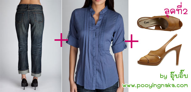 กางเกงยีนส์ของแฟนหนุ่มเอามาพับขา นอกจากจะได้ความเท่ห์แบบผู้ชาย แต่ทำให้ขาเราดูยาวขึ้นอีกด้วยนะคะ ส่วนเสื้อจะเป็นเสื้อเชิ้ตเข้ารูปพับแขน สีอะไรก็ได้ค่ะ จะช่วยพรางช่วงหลัง ทำให้ดูมีเอว และรองเท้าดูตามรูปเลยค่ะ