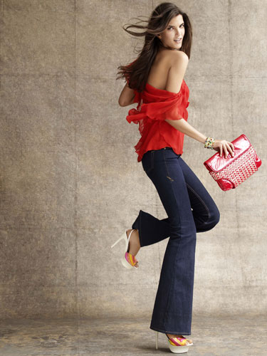 เสื้อเชิ้ตสีม่วงอ่อนๆตัดกับเสื้อคลุมจะเป็นแจ๊คเก็ตยีนส์หรือไม่ก็ได้ กระดุมเม็ดใหญ่ๆ จะทำให้ดูเด่นขึ้น กระเป๋าสะพายให้ใช้โทนสีเดียวกับเสื้อเชิ้ต กางเกงยีนส์ขาบานกับเข็มขัดเส้นเล็กสีน้ำตาล ไม่ควรมีเครื่องประดับมากจนเกินไป