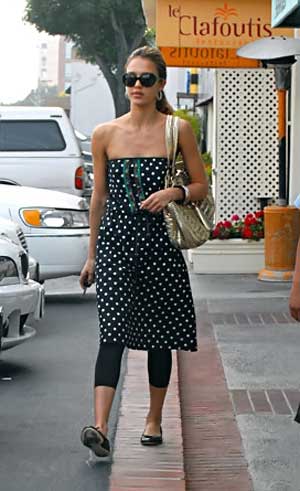 Jessica Alba สวมชุดลายจุดกับเลกกิ้งสีดำ และกระเป๋าสีเงินเมทัลลิค แว่นตากันแดด และรองเท้าบัลเล่