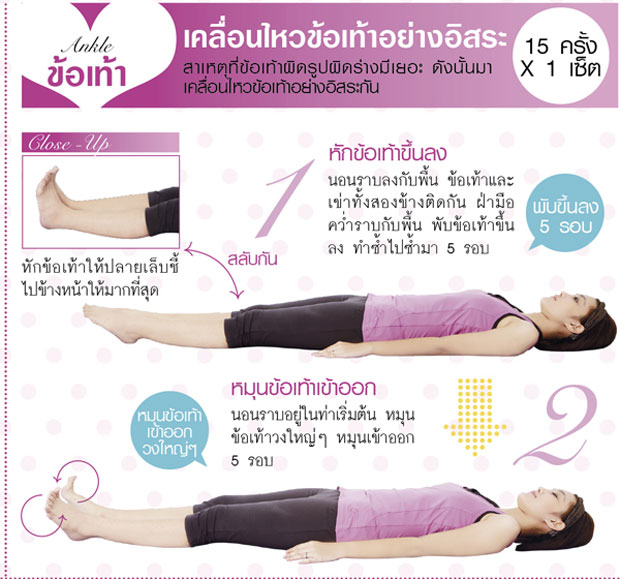 1. หักข้อเท้าขึ้นลง : นอนราบลงกับพื้น ข้อเท้าและเข่าทั้งสองข้างติดกัน ฝ่ามือคว่ำราบกับพื้น พับข้อเท้าขึ้นลง ทำซ้ำไปซ้ำมา 5 รอบ