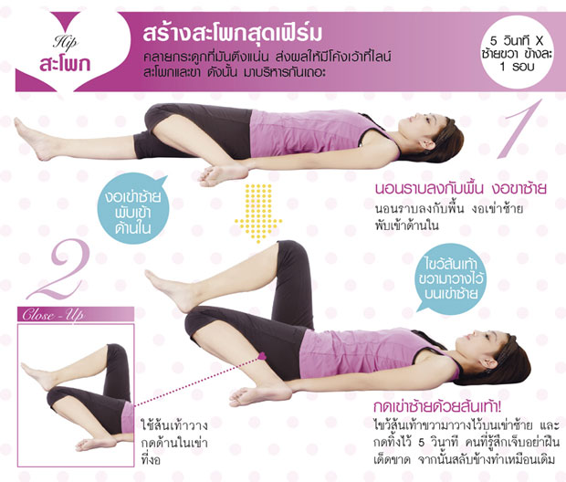 Hip (สะโพก) : สร้างสะโพกสุดเฟิร์ม : คลายกระดูกที่มันตึงแน่น จะส่งให้มีโค้งเว้าที่ไลน์สะโพกและขา ดังนั้น มาบริหารกันเถอะ (5 วินาที X ซ้ายขวา ข้างละ 1 รอบ)