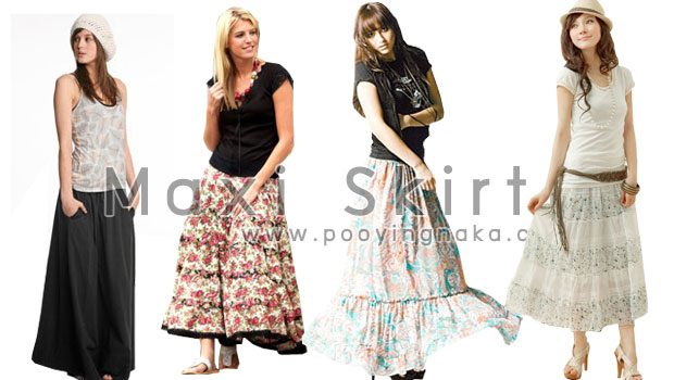 กระโปรงแบบ maxi ที่กำลังนิยมกันอยู่ จะมีความยาวไปจนถึงข้อเท้าหรืออาจจะยาวกว่านั้น สาวๆที่รูปร่างสูงจะได้เปรียบกับเทรนด์นี้ค่ะ เพราะใส่แล้วสวย เทรนด์ที่เราเห็นกันในปัจจะบันมักจะเน้นลาย แต่ความจริงแล้วแบบเรียบหรือลายน้อยๆก็ใช้ได้เหมือนกันค่ะ