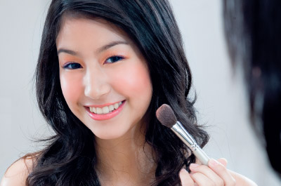 - ปัดแก้มด้วยบลัชออนสีชมพู อย่าลืมเคาะสีออกจากแปรงเล็กน้อยบนหลังมือก่อนปัด เพื่อไม่ให้สีเข้มเกินไป
