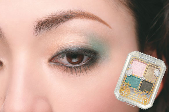เตรียมผิวหน้าเรียบร้อยก็มาเริ่มในจุดสำคัญคือดวงตาที่ต้องคมเด่น กลมโต โดยใช้อายแชโดว์ที่มีสีสันเพื่อให้ดูสดใส เช่น สีเขียว ชมพูอมส้ม น้ำตาลประกายทอง ใช้อายแชโดว์เบสทาให้ทั่วเปลือกตา จากนั้นทาสีน้ำตาลทองเน้นบริเวณขอบพับตา ด้านล่างทาจากหางตามาถึงหนึ่งในสามของตา หางตาทาสีเขียวเบลนด์ให้กลมกลืนกับสีน้ำตาลทอง ทาสีเขียวเข้มชิดแนวขนตาทั้งบนและล่าง ส่วนหัวตาทาอายแชโดว์สีขาวบาง ๆ เพื่อให้เป็นประกายสดใส กรีดอายไลเนอร์เพื่อให้ดวงตาดูกลมโต โดยกรีดตามรูปตาชิดแนวขนตามากที่สุด ถ้าอยากดูเปรี้ยวให้กรีดสะบัดหางขึ้นมาเล็กน้อย ดัดขนตาแล้วปัดมาสคาร่า