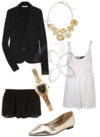 ลองเลือกเป็นเสื้อแขนกุดสีขาว มีดีเทลสักเล็กน้อย สวมกับสูทเข้ารูปและกระโปรงสั้นสีดำ ส่วนรองเท้าเพื่อให้เข้ากับลุคเลือกแบบไม่มีส้นจะดีที่สุดและสีที่เข้ากันได้ดีคือเมทัลลิค