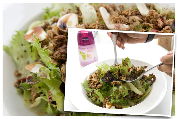 นั่งไปได้สักพักเริ่มมีคนทะยอยเข้ามาในร้าน หันไปดูนาฬิกา เอ้าใกล้เที่ยงแล้วนี่นาคนเลยเริ่มเยอะ หนูแจ่มเองก็เริ่มหิวแล้วด้วยสิ่ พี่ที่ร้านก็จัดนี่มาเลย “สลัดทูน่า” จานนี้เบาๆ เพราะตั้งใจจะเก็บท้องไว้ทานเค้กของที่ร้านเค้าน่ะ แอบดูที่ร้านเค้าเตรียมเมนูนี้ วิธีทำก็ง่ายๆ คือนำเนื้อทูน่าในน้ำเกลือมาผัดกับเครื่องปรุงใส่พริกเล็กน้อยให้รสจัดหน่อยๆ ถูกปากคนไทยนะคะ จากนั้นเอาทูน่าที่ผัดแล้วมาคลุกเคล้าให้เข้ากันกับผักสดโดยจานนี้ผักที่ใช้ก็จะเป็น พวกฟิลเลย์ไอซ์เบิร์กแล้วก็เรดโอ๊คไรงี้ กรอบอร่อยไม่อ้วนค่ะ สำหรับน้ำสลัดที่นี่เขาจะใช้เป็นซอสวาซาบิซึ่งสำหรับคนที่ชอบหวานก็อาจเพิ่ม “มิตรผลไซรัป” เข้าไปเพิ่มความหวานกลมกล่อมด้วยก็ได้นะคะ