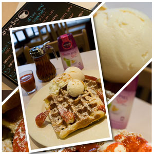 เมนูนี้เป็นวอฟเฟิลชิ้นใหญ่ยักษ์ที่เสิร์ฟพร้อมสตรอเบอรี่ลูกโตและไอศกรีมวานิลลาเย็นเจี๊ยบโรยหน้าด้วยถั่วอัลมอนด์ หน้าตาสวยงามอลังการน่าทานจริงๆ แป้งที่ใช้ทำวาฟเฟิลของเขากรอปนุ่มอร่อยดี ทานไปนี่ละลายบนลิ้นเลย แต่ถ้าจะให้อร่อยกยิ่งขึ้นต้องทานคู่กับไอศกรีมวานิลลาที่เสิร์ฟมาคู่กันถือว่าลงตัวเลยนะ นอกจากนั้นยังมีวิปครีมกับวิปบัตเตอร์อีกด้วย อย่างหลังนี่น้องพนักงานที่ร้านบอกว่าเป็นเนยรสจะออกมันๆ และมีรสเค็มนิดหน่อยแต่ก็อร่อยดีค่ะ