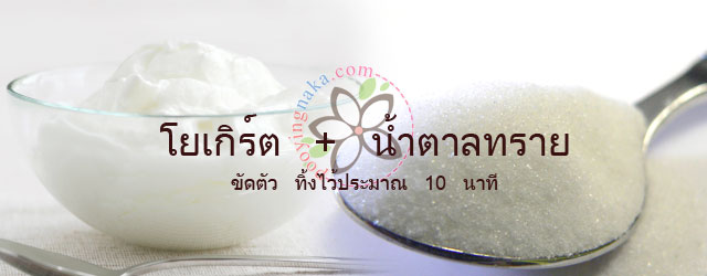 1. นำน้ำตาลทรายผสมโยเกิร์ตรสธรรมชาติในปริมาณเท่ากัน ขัดตัว ทิ้งไว้ประมาณ 10 นาที