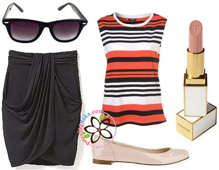 ลุคคลาสสิคๆแต่ชิคสุดๆ เหมาะกับทุกโอกาสเลยทีเดียว จับคู่กระโปรงกับเสื้อยืดลายขวางสีจี๊ดๆสักตัว และรองเท้าส้นแบนสีนู้ดๆหน่อย แต่เพื่อความเป็นมินิมอล ง่ายๆแต่โมเดิร์น แนะนำให้เพิ่มเครื่องประดับเพียงชิ้นเดียวคือแว่นกันแดด สำหรับการแต่งหน้า ควรเป็นลิปสติกสีนู้ดจะเข้ากันดีที่สุด ทำผมบันสูงๆ ชิคมากกกก