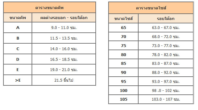 ตารางเทียบขนาดยกทรง( ขนาดคัพ-ขนาดไซ ส์ )