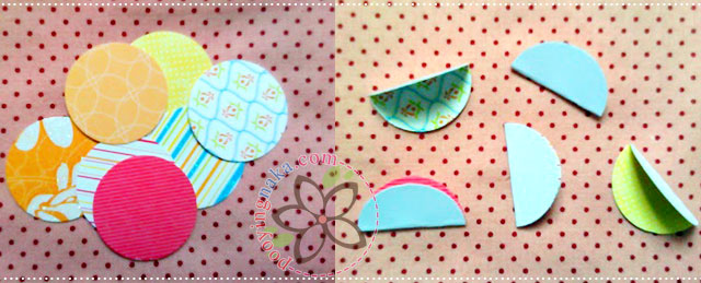 DIY นี้ง่ายค่ะ มีลูกหลาน ก็ชวนมาทำซะด้วยกันเลยค่ะ เพียงแค่หากระดาษหลากสีสัน หรือจะใช้เป็นกระดาษรีไซเคิลที่เราไม่ใช้แล้วก็ได้ หรือจะใช้กระดาษขาวอย่างเดียวก็ได้ค่ะ แต่ควรจะแข็งนิดนึงนะคะ ตัดเป็นวงกลม 7 วง/ 1 อัน หลังจากนั้นให้พับครึ่งวงกลมโดยเอาด้านที่ไม่มีลายหรือด้านที่เราไม่ใช้ขึ้นด้านบน