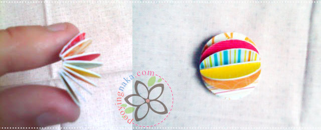 จากนั้นทากาวทีละชิ้นและนำมาแปะกันไปเรื่อยๆจนเป็นลูกบอลกลมๆ ตรงกลางจะมีช่องนิดหน่อยเอาไว้สอดเชือก