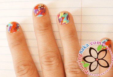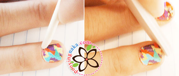 จากนั้นแปะสติ๊กเกอร์และใช้ตะไบให้เข้ารูปกับเล็บของเรา