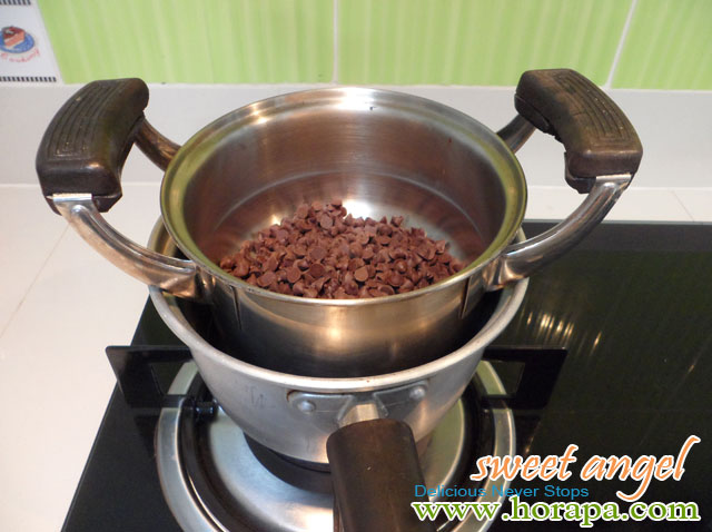 5.ละลายชอคโกแลตบนเตา ใช้แบบตุ๋นรองน้ำนะคะ นำหม้อที่ขนาดใหญ่กว่าใส่น้ำตั้งไฟ แล้วใส่ชอคโกแลตที่จะละลายบนหม้ออีกใบที่ขนาดเล็กกว่า