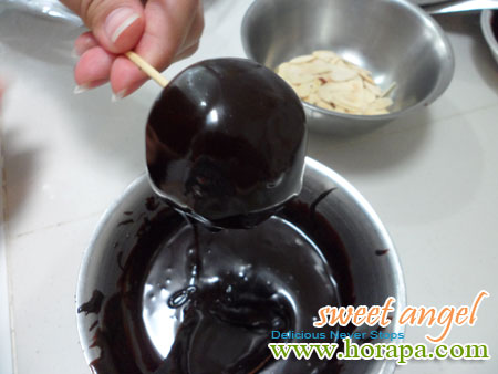 Tips:ถ้าใจร้อนสามารถเข้าช่องฟรีซได้ค่ะ จะทำให้ง่ายมากตอนชุบชอคโกแลต แต่ห้ามลืมน้องขนมทิ้งไว้นะคะ T_T