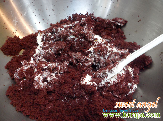 2.บัตเตอร์ครีม ปริมาณประมาณครึ่งนึงของเนื้อเค้ก(กะให้ผสมกันแล้ว หนืดๆปั้นเป็นลูกกลมๆได้ค่ะ) อันนี้คงยุ่งยากสักหน่อยเพราะต้องทำจากเนยสดตีผสมกับนมข้นหวาน หรือน้ำเชื่อม แต่สำหรับคุณที่ไม่มีอุปกรณ์ก็ใช้แค่เนยสดละลาย+น้ำตาลทราย ละลายเป็นน้ำเชื่อมพักคลายร้อยแล้วเทลงในเนื้อขนม ค่อยๆเททีละนิด แล้วนวดดู พอปั้นได้ก็พอค่ะ---->วันนี้เราใช้บัตเตอร์ครีมที่เป็นครีมชีสค่ะ