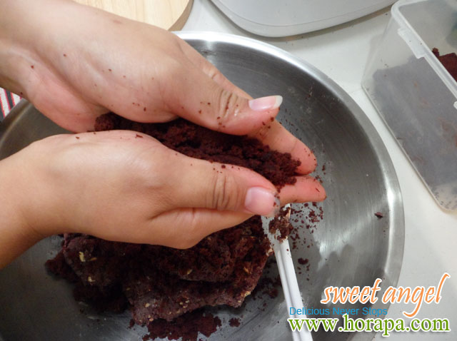 Tips:สิ่งที่เราต้องการคือ เนื้อเค้กที่ร่วนออกจากกันเป็นผงๆค่ะ ห้ามบีบ หรือกดให้เนื้อเค้กแน่นเป็นก้อนเด็ดขาด