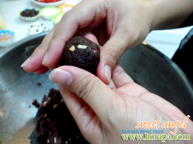 Tips:ถ้าใส่น้อยไปเนื้อจะร่วน ไม่เกาะกัน แต่ถ้ามากไปเนื้อจะแฉะ เหลวๆติดมือ เมื่อนำไปชุบชอคโกแลตจะละลายไปกับชอคโกแลต